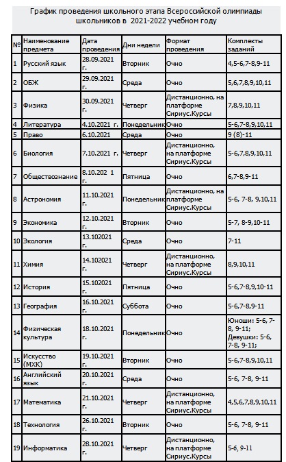 График проведения школьного этапа Всероссийской олимпиады школьников