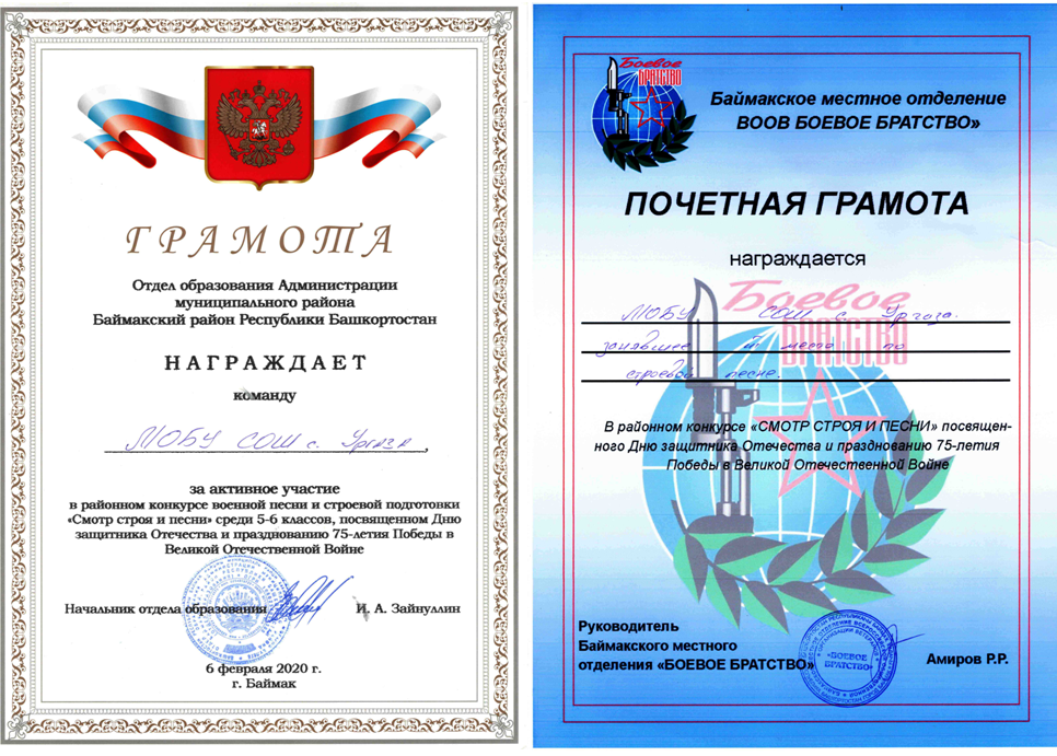 6 февраля на базе МОБУ СОШ №1 г. Баймка, провели районный конкурс военной песни и строевой подготовки «Смотр строя и песни» среди 5-6 классов, посвященного Дню защитника Отечества и празднования 75-летия Победы в Великой Отечественной Войне.