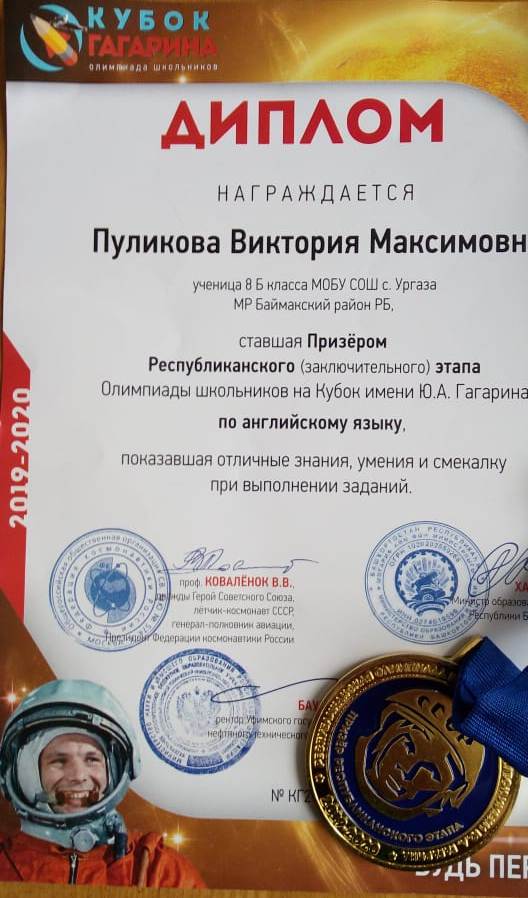 Поздравляем призера Республиканского (заключительного) этапа по Английскому языку Пуликову Викторию Максимовну. Олимпиада Кубок им Ю.А. Гагарина.