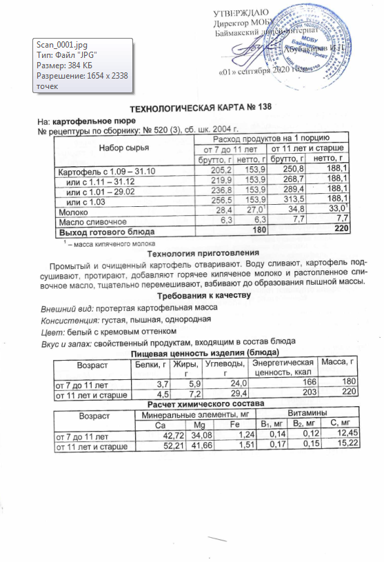 Технологическая карта N138 картофельное пюре