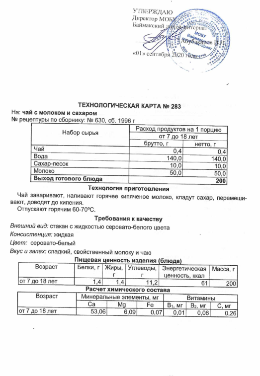 Технологическая карта N283 чай с молоком и с сахаром